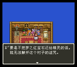 进村后发现这里很奇怪,所有的人都静止不动,全都在沉睡之中,幸好左下 角的屋子里有一个正常的人,向他询问后得知必须将梦之红宝石归还给精灵才能解 开诅咒,同时得知了精灵村的位置。