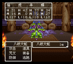 BOSS战:八歧大蛇HP较多,攻击力高,尤其火焰攻击是全体伤害,万一RP不 好,BOSS一回合喷了2次火可能就要死人了,没有僧侣比较难打。