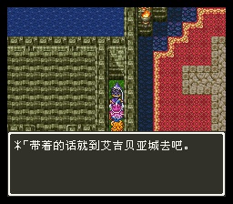 进村后是可以向上走的,不要被欺骗了。上面就是神殿,这里有一只史莱姆 ,它告诉主角要带着隐身草去艾吉贝亚城。这里还可以打听到最后钥匙的消息。随 后就可以离开了。