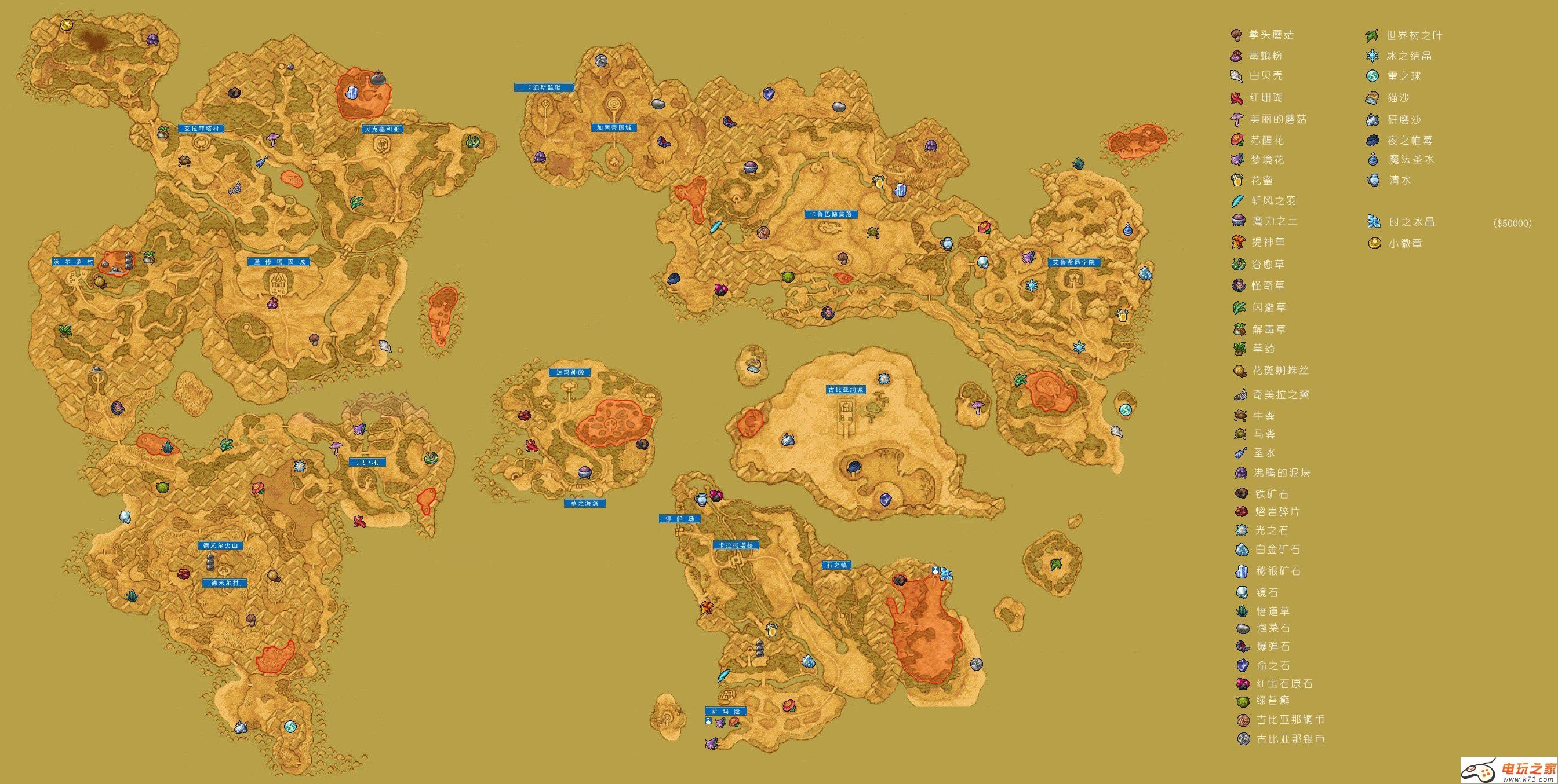 《勇者斗恶龙9》为了对应掌机的便携性与联机功能,首次在游戏中加入了合成炼金系统,游戏中的所有装备、道具、武器均可以通过炼金釜来实现,而这些合成的原材料玩家可以通过打怪、大地图分布、藏宝图boss掉落等手段来获得。下面就给大家带来本作中全部内容的合成公式及所需材料的详情及分布所在,配合下面这张中文版的带全部材料所在地点的世界地图,相信刷素材合成强力装备再也不是难事。