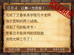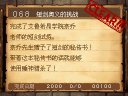 短剑技能达到100,并解决艾鲁希昂学院的事件后。右下学生宿舍内的奈乔老师对话。 PS:本次任务需要干掉西纳扎姆地方的186号钢铁魔神。先使用短剑技能剧毒短剑使其中毒,然后用短剑技能死神猎杀打倒。是打10回合,并不是打10只,一场战斗中按要求打败一只即可,累积10次。 作为谢礼得到秘传书“睡神猎杀” |