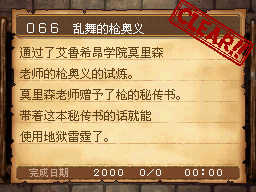 枪技能到100,并解决艾鲁希昂学院的事件后。学院左侧的体育館内的莫里森对话。 PS:群攻的试练;用枪高级技能五月雨突同时干掉2只或以上的172号暗黑蜗牛。 作为谢礼得到秘传书“地狱雷霆” |