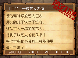 旅艺LV40以上,到达玛神殿B1F,与幽灵巴农对话。 PS:战斗使用曲艺技能装傻让敌人出现大笑状态连续五次(必须是会心的装傻)。然后到圣修塔因城内B1F的监牢内与NPC对话。 作为谢礼得到旅艺秘传书“战斗之歌” |