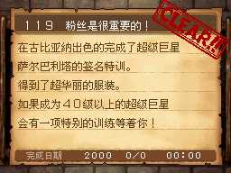 超级明星LV15以上,古比亚纳城下町左上的舞吧内,与萨尔巴利塔对话。 PS:用超级明星的技能:签名攻击(花费50G,金钱攻击)并出会心一击打倒任意一个怪物。 作为谢礼得到超华丽的服装 |