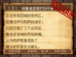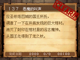 任务地点:和圣修塔因城的国王对话 任务要求:打败古代魔神 任务做法:从城中的下水道去地下埋着棺材的地方,剧情后打败BOSS。 任务报酬:龙之杖(还看到了王家的配方) |