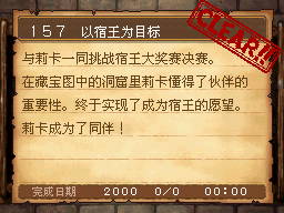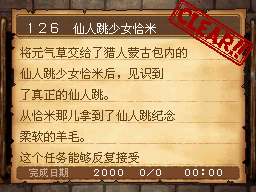 任务地点:圣修塔因城旅店的莉卡 任务要求:宿王决胜战 任务做法:先去找国王,然后去遗迹类宝物迷宫中打败钢铁布鲁得加(219号怪)20只。 任务报酬:莉卡成为同伴 |