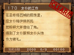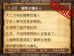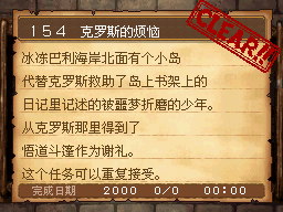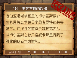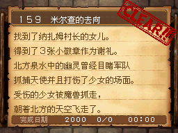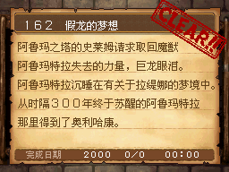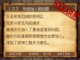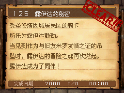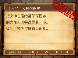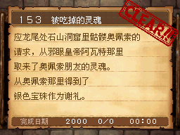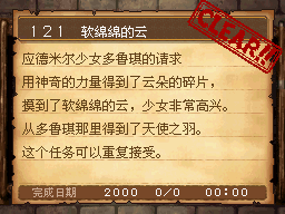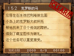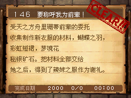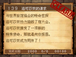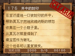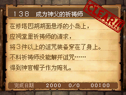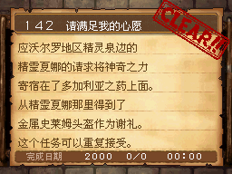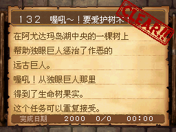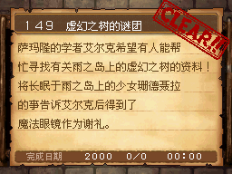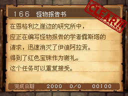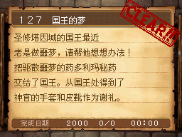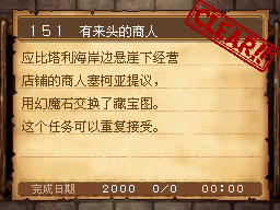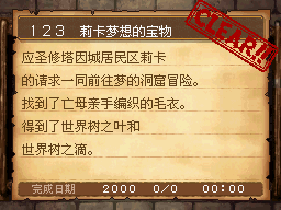 任务地点:圣修塔因城下镇,旅店里的莉卡对话(必须绕过柜台才可以) 任务要求:找一张带有“梦”字的藏宝图并且通关 任务报酬:世界树之滴和世界树之叶 |