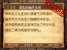 任务地点:古比亚纳沙漠高地的毒气沼泽(晚上才能接) 任务要求:幽灵要你找来书信和传家宝首饰 任务做法:通关水的宝物地图后得到任务道具 任务报酬:满月戒指 |
