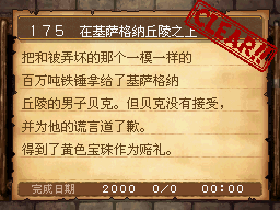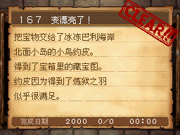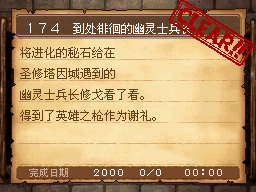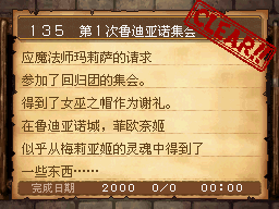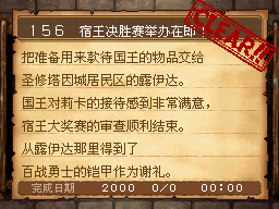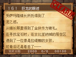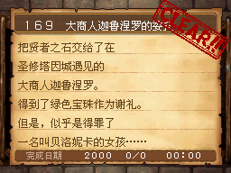 任务地点:萨玛隆的女村长 任务要求:完成事件 任务做法:首先去古比亚纳城和道具店旁边的宝石商对话,然后找一个有8F以上带有“命运”字样的迷宫通关,获得钻石王,把这东西交给商人后换到龙之泪,再回去交给村长结束任务。 任务报酬:金块 |