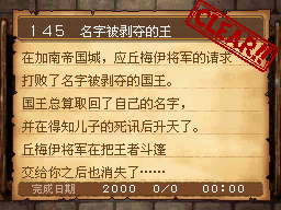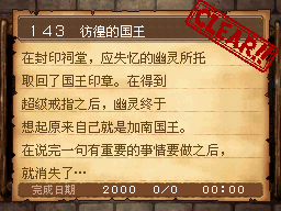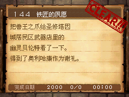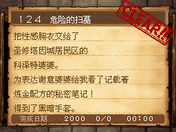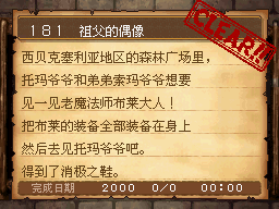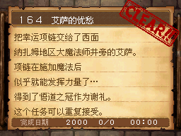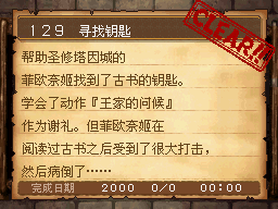 任务地点:圣修塔因城和菲欧奈公主对话 任务要求:寻找书的钥匙 任务做法:接到任务后去城下镇道具店和老头对话,他说那钥匙在某个宝物迷宫中,通关带有“高贵”字样的迷宫即可完成任务,任务道具在打败BOSS后取得,将钥匙交给公主(已经回到房间里了),公主打开书后昏迷了........... 任务报酬:王家的问候(动作) PS:如果你照游戏中的方法是永远找不到“高贵”字样的图的,因为是不存在的(可能是翻译问题吧),通关“命运之地图”,笔者成功得到任务道具。 |
