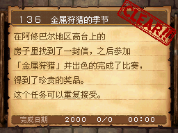 任务地点:阿修巴尔地区的高地(调查书架) 任务要求:在一场战斗中打败3只金属史莱姆,合计3次。(地点为沃尔罗地区的高台) 任务做法:同要求,但是在遇怪后怪物群中要有3只金属史莱姆,并且全打败,如果遇到只有2只或1只,就算全打败了也无效。 任务报酬:金属史莱姆盾 PS:这个任务可反复接受 |