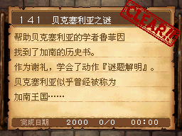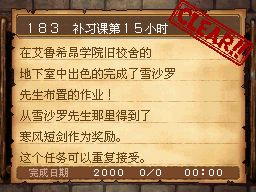 任务地点:贝克塞利亚的鲁菲因(晚上去找他才能接) 任务要求:找来加南的历史书 任务做法:去被封锁的监狱B3F调查书架 任务报酬:谜题解明(动作) |