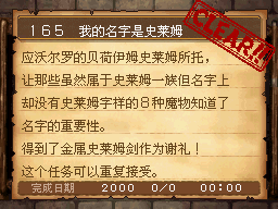 任务地点:沃尔罗村的井中 任务要求:打败那些虽然属于史莱姆一族但名字上没有史莱姆字样的8种魔物 任务做法:打败8种怪,分别是75号金属史莱姆骑士、89号金属史莱姆塔、153号散失金属史莱姆、207号黄金史莱姆塔、214金属史莱姆王、215号神骑士、229号白金史莱姆王、252号迪迦。 任务报酬:金属史莱姆剑 |