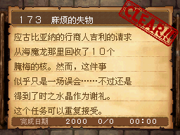 任务地点:古比亚纳城下镇防具店旁的旅行商人 任务要求:取得10个饭团(腌梅的核?) 任务做法:干掉10次海魔龙(256号怪) 任务报酬:时之水晶 PS:这个任务可以反复接受 |