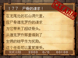 任务地点:龙之尾的洞穴(坐火车去) 任务要求:完成任务 任务做法:用碎心锤给予英灵骑士最后一击,得到超级骨头回去交任务。 任务报酬:生锈的铠甲 PS:这个任务可以反复接受 |