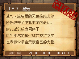 任务地点:莉卡旅店的天使拉维艾尔 任务要求:复活伊扎亚尔 任务做法:接到任务后先去宝物迷宫中打败魔剑神雷帕鲁德(292号怪)取得女神的祈祷,然后和旅店的天使对话,再去神之国找女神,剧情后返回城里再和天使对话,然后去沃尔罗村的天使像前和伊扎亚尔对话,剧情后,伊扎亚尔加入,最后和旅店天使对话结束任务。 任务报酬:伊扎亚尔成为同伴 |