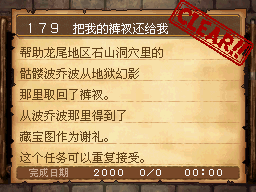 任务地点:龙之尾地区的洞穴 任务要求:从地狱幻影那取回裤衩(212号怪) 任务做法:先用装傻让它发笑,再用偷窃。 任务报酬:LV1拉普索恩地图 |