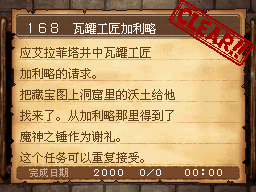 任务地点:艾拉菲塔村宿屋旁的井里 任务要求:找来沃土 任务做法:到一个土地形的藏宝图里打败BOSS后获得,并且迷宫要在12层以上才有效。 任务报酬:魔神之锤 PS:这个任务可以反复接受 |