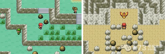 继续往上走,使用冲浪后到达灯火山。上到山腰后在左面进入山洞,一直往上走,走到顶层后推开石头可以遇见火焰鸟,尽力收服吧。