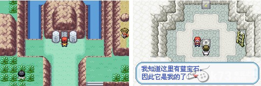 从6岛的右面往下走能够看见一个山洞,不过门关住了。用居合斩将门打开后进去,按顺序掉入上,左,右,下的洞,发现蓝宝石。可刚拿起来就被尾随的来的NPC抢走了,他留下了一段火箭队仓库的密码后离开了。