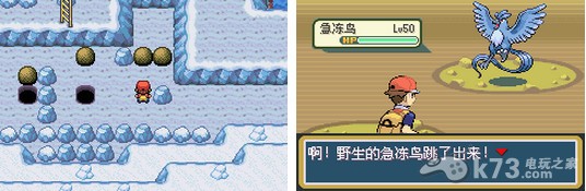 急冻鸟在红莲岛右面的双子岛上。先去浅红市,然后用冲浪向左走到达双子岛,进入后先得使用怪力,将大石头推到洞里,最后堵住水道使水流平缓。然后在最深一层使用冲浪就能看见急冻鸟。