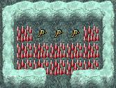那么就来说说这些情况:本迷宫有99层,而从头到尾都是没有可能拣到面包的,只能自己带,如果指轮没有【腹】的能力的话,就比较麻烦了,要带很多才足够,所以至少得有【腹もち】的能力。能在地板上看见的道具还有武器类道具,不过这个肯定是怪物箱变化而来的,这个迷宫里能得到的武器都在特殊部屋里了。宝物都在墙壁里,居然有在まぼろしの洞くっ的特殊部屋里才有的几个稀有的指轮!除了这些以外,这个迷宫的墙壁里的指轮几乎包括了游戏中所有的种类;另外还可以挖到一些杖、矢、卷物、壶以及小徽章和钥匙,所以进迷宫前记得要多带つるはし(镐头)或者トンネルの杖。还有本迷宫怪物的强大也是空前的,要是没有+99的盾,到了后面就会感到相当的吃力:在中后期出现的怪物都是攻击?特殊类,而且等级也不低(到了最后几层更是有等级为10的……推算攻击力大于560),被它们好好照顾的几下就会丢掉半条命,要是没有盾的小波……到了后期和8级以上的怪物做个亲密接触,嘿嘿……Ring的记录是被一击打掉681HP,而MAXHP才500,555555,惨啊T-T。其他怪物都还好说,可以用クォ-タ-の杖或者もろはの杖或者其他状态杖来辅助消灭,但是就是那个约50F以后的不怕魔法、特技的ジャスティス兄难缠,还好出现几率并不高。后期的怪物由于实在是太强大的,没有强的离谱的武器和盾是很难和那些怪物抗衡的,还是以逃跑为主吧,就是利用レミ-ラの杖先找到楼梯,然后可以用场所かえの杖和とびつきの杖来快速潜行到下一层。不过这么做不提倡,毕竟在深层的店里可是有卖稀有的道具的……矛盾啊,唉……而且在这个迷宫里大量出现弱化和封印陷阱,要是在后期这些陷阱把重要的能力封印掉或者把盾的附加值降低到0的话可真是太危险了(实际上是经常发生),解决办法是用ミミックの杖把一怪物变成怪物箱,然后让其猛K自己,而是老特的话还可以对怪物连续射几根毒矢来降低怪物的攻击力,这样才不至于死的很难看。由于可以带道具进去且数量不受限制,需要带的道具有很多,比如一些辅助攻击的杖和逃跑用的杖等等,还有一大堆回复壶,其他的就看个人的战法了,就不再浪费什么笔墨了。