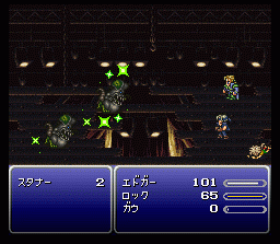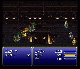 战斗要点:战斗开始后会遇到ゴエティア(EXP 145)和两只スタナー,スタナー在ゴエティア被击倒后被魔法打中会逃跑。所以一开始先用艾德加的电钻集中打死ゴエティア,然后用魔法给スタナー补血(切换全体)让它们逃跑,只获得ゴエティア的145点经验。战斗结束后,三人获得48点经验值。