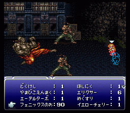 开战嘎变身为レッサーロプロス,艾德加用ドリル,洛克负责回复。对于BOSS的レベル3コンフュ,只有6级的艾德加会中,所以装备丝带防御。カッパソング来的时候,嘎处于レッサーロプロス状态是没有影响的,另外两人也用装备抵御。所以接下来的战斗只要注意HP状态就可以了。