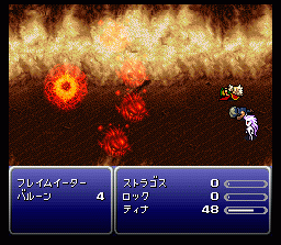 FLAME EATER一开始会召唤四只バルーン,过程中不要打死バルーン,不然 得到经验。集中攻击BOSS。战斗前全部装备反弹戒指反弹BOSS的火魔法,洛克装备盗贼之腕轮负责偷取フレイムタン与回复,蒂娜和老头装备耳环扔冰之杖(こおりのロッド)主攻,两三回合就可以结束战斗。注意:冰之杖一按出来使用默认是全体攻击,先切换单体再指到フレイムイーター身上,不要手快扔出去把バルーン都打死了。