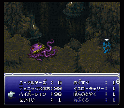 *“混乱+烟玉”方法说明:队伍至少两人,其中一人先向另一人放混乱魔法コンフュ,另一人在混乱魔法释放的时候(满屏大鸟)使用烟玉(けむりだま),会让敌人强制撤退。烟玉的作用本来是让己方全员强制撤退,但设定上不能对敌人使用,所以要同伴混乱后扔出。这在后期让莫古学舞蹈的时候很有用。需要特别说明一点,烟玉只能在可以逃跑的战斗中发生作用,而混乱+烟玉也是同理,当己方不能逃跑的时候,让敌人强制撤退也不可能实现。
