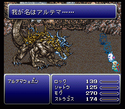 在三斗神像前面,被一只巨兽挡住去路。这家伙就是以后每代都作为隐藏BOSS出场的ULTIMAWEAPON!