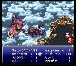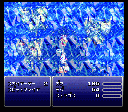讨厌的章鱼第四次袭击。战斗前给一个同伴装备ファントム魔石放出全体透明,就不怕章鱼的攻击了,然后用火魔法慢慢烧它,这样很快这场BOSS战就会进入第二回合,钱多的话丢2根炎のロッド也可以。