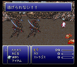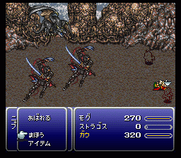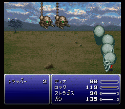 其中的ニンジャ绝对是玩家的噩梦!之前在封魔壁洞穴的机关可遇到,不过当时可避过不打。而魔大陆上的ニンジャ通常是两个一起出现,速度快,杀人更快。重点:遇上他们是不能逃走的,只有RESET。唯一的生机,就是ニンジャ×2和プラチナドラゴン一起出现的时候,这真是千载难逢的好机会,莫古和嘎两人各丢一根雷のロッド,就可以一击干掉一个ニンジャ(或用即死魔法),剩下飞龙不杀就可以逃走了。而且以后在兽之原就可以遇见ニンジャ。幸好魔大陆的怪物够“种类繁多”,忍者出现率不算高,并没有想象中痛苦。而魔大陆有三个宝箱,其中一个有ギガントス守护,这家伙有7000多的经验,不能打。日后更不能在兽之原遇到ギガントス,意味着无法完成暴制霸。(等等,谁这么无聊说要完成暴制霸的?)