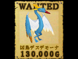 在大陆北方来回飞翔的大鸟怪物,时不时会跑去庇护要塞和试作型高达打招呼什么的。通关前最强的赏金首。由于它的活动范围太大了,因此还是自己看看下屏幕地图北方的红点寻找并拦截吧。战车战。HP50000、攻击750、防御800、速度250,抗性火25光200毒100冷25(火冷△毒光X)。 攻略:凶鸟的主要攻击方式就两种,一是火神炮乱射,威力比较高;二是轰炸,对我方全体数次连续攻击,伤害相当高,是它的杀手锏。凶鸟强大在于每回合2~3次行动,而且会将行动投入到凶猛的攻击中。不知道是不是错觉,闪光的凶鸟竟然比正常的要简单? |