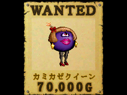 在西大陆南方一大片沙漠中徘徊的神风一族的老妈,继承了神风家族的传统——移动速度快。不过由于是在大地图上出现的,因此比前两作要容易发现,但是在靠近她前,会有一个特写镜头,然后她会高速逃跑,如果没有信心追上她的话准备火箭助推器吧。战车战。HP3333、攻击500、防御2000、速度255,抗性毒100(火冷电音光△毒X)。 攻略:除了速度快以外,她还爱逃跑,往往才交战一两个回合就开溜了,一旦让她溜了,就只能再进建筑物之后刷新出来了。防御高的不象话是她的另一个特征,不过没关系,会心一击是无视防御的,可以利用猎人的特技或者红狼车的会心一发特性。她的HP不多,也可以使用摔跤手的第一个无视防御的技能,然后一个台风连续削可以轻松给她重创。打这个赏金首更重要的不是实力,而是运气——这也是神风家族的传统。 |