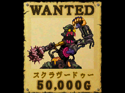 出没在垃圾山的赏金首,该赏金首为随机遭遇战,有可能随着杂兵一起出现。HP10000、攻击800、防御100、速度180,抗性火光电音毒冷100。 攻略:抗性相当华丽的赏金首,然则却对通常攻击无抵抗力,于是我们就用大炮啊导弹啊什么的往它身上招呼吧。它就三板斧:头部的火焰喷射,基本可以无视;左手的扔垃圾攻击,这个是全体攻击,伤害也不算高;比较可怕的是右手的铁锤,一打一个会心,战车的SP不多的话零件容易被打烂,可以猛攻它的本体,很快就能胜利。如果不先攻击这个家伙的本体而是先打头和手,那么它被打到一定程度时,身上的小家伙们会一个个地被打下来作为杂兵参战,依然是抗性全满,依然用通常属性的武器去招呼即可(闪光的EXP和钱都是2000)。 |
