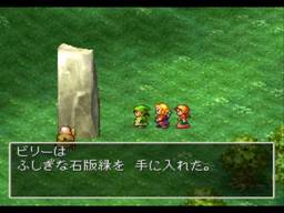 回到现实世界ダイアラック(Dialac)所在的地方,此处还是那样荒凉,和石柱前的老人对话后,他会要求主角一行从各地介绍人到这里来定居开发,在石柱左方可以找到ふしぎな石版緑(Wind Shard)!