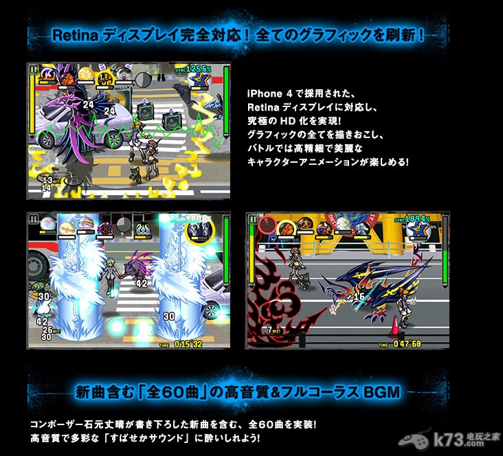 本作的游戏画面借助ipone4的精细画质表现的更加优秀,重制后的游戏画面一定会让大家满意。另外,本作中将会收录超级60首的超高音质的BGM,玩过nds版本的玩家都知道,本作的音乐绝对是亮点之一!