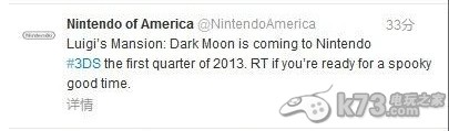 根据任天堂北美方面的最新推特消息显示,任天堂将于明年的第一季度将其路易鬼屋的最新作《路易鬼屋 暗月》发售在3ds平台,这款跳票n久的作品希望在明年能够如期发售。