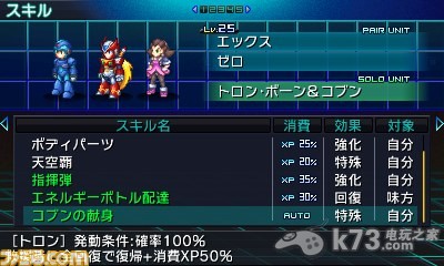 本作中,两人一组的双人组合以及双人组合的solo个人组合存在。玩家地图画面上发动任意的技能,可以习得自动效果的自动技能。另外,技能的使用均需要耗费“XP”,越是强力的技能,需要耗费的XP越多,所以在什么时候使用就显得非常关键了。