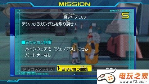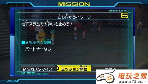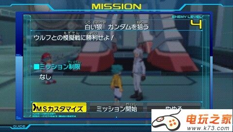 触发剧情后,出现UE的MS,白狼的G-EXES会成为我方,这时功能键R键的左右选项又多了个 功能选择僚机的模式,援护,突击 ,一般来说选择援护。。UE的MS这里都不强力,用近战打硬直即可轻松过关。结束战斗后 触发剧情。