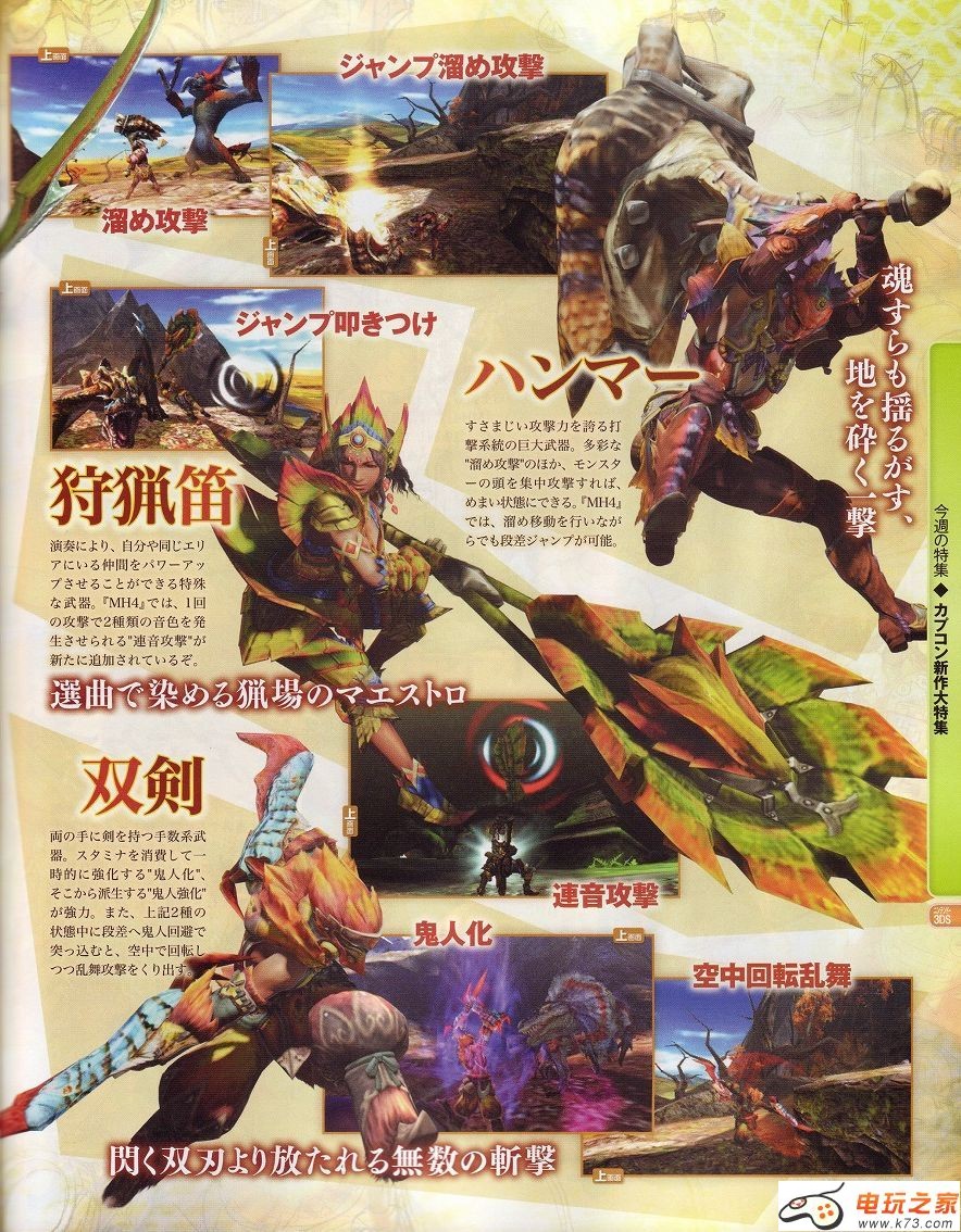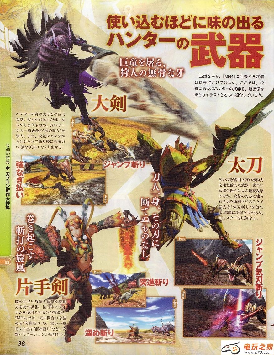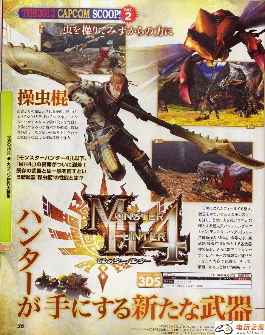 本周的fami通杂志上公开了近日来谣传的《怪物猎人4》新武器的消息,本作已判明的新武器名为【操虫棍】,是一种机动和连续攻击都非常灵活的武器,而新的怪兽和动作、技能等也得到了公开,下面让我们一起来看看吧!