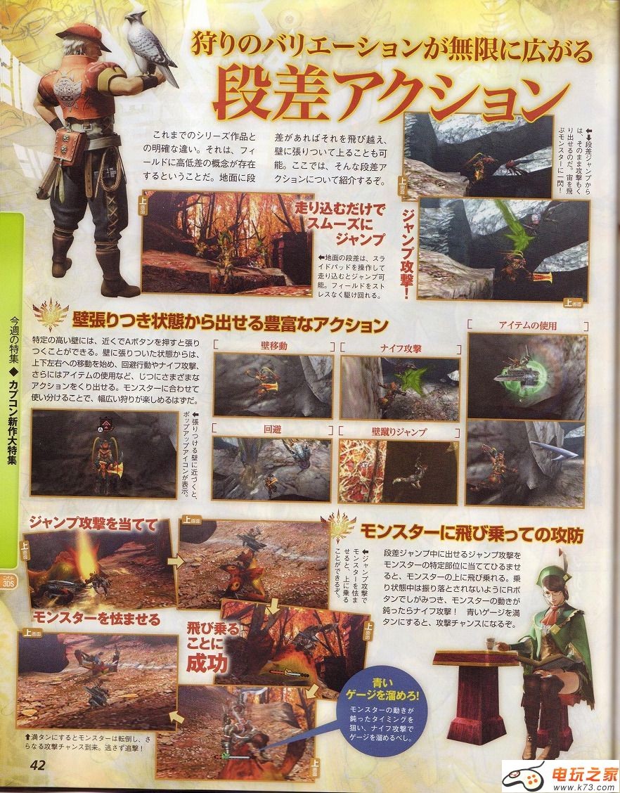 当玩家操纵猎人到有高低差的地点时就可以使用跳跃,在跳跃的过程中甚至可以使用攻击等动作。而在高低差所使出的跳跃攻击打中怪物的特定部位将可以乘坐於怪物身上并且飞行,为了不被怪物甩出来要按R键紧夹怪物,并使用小刀进行攻击。当猎人小刀攻击成功时就会产生能量,当能量满了後就能使出能让怪物摔倒的攻击。