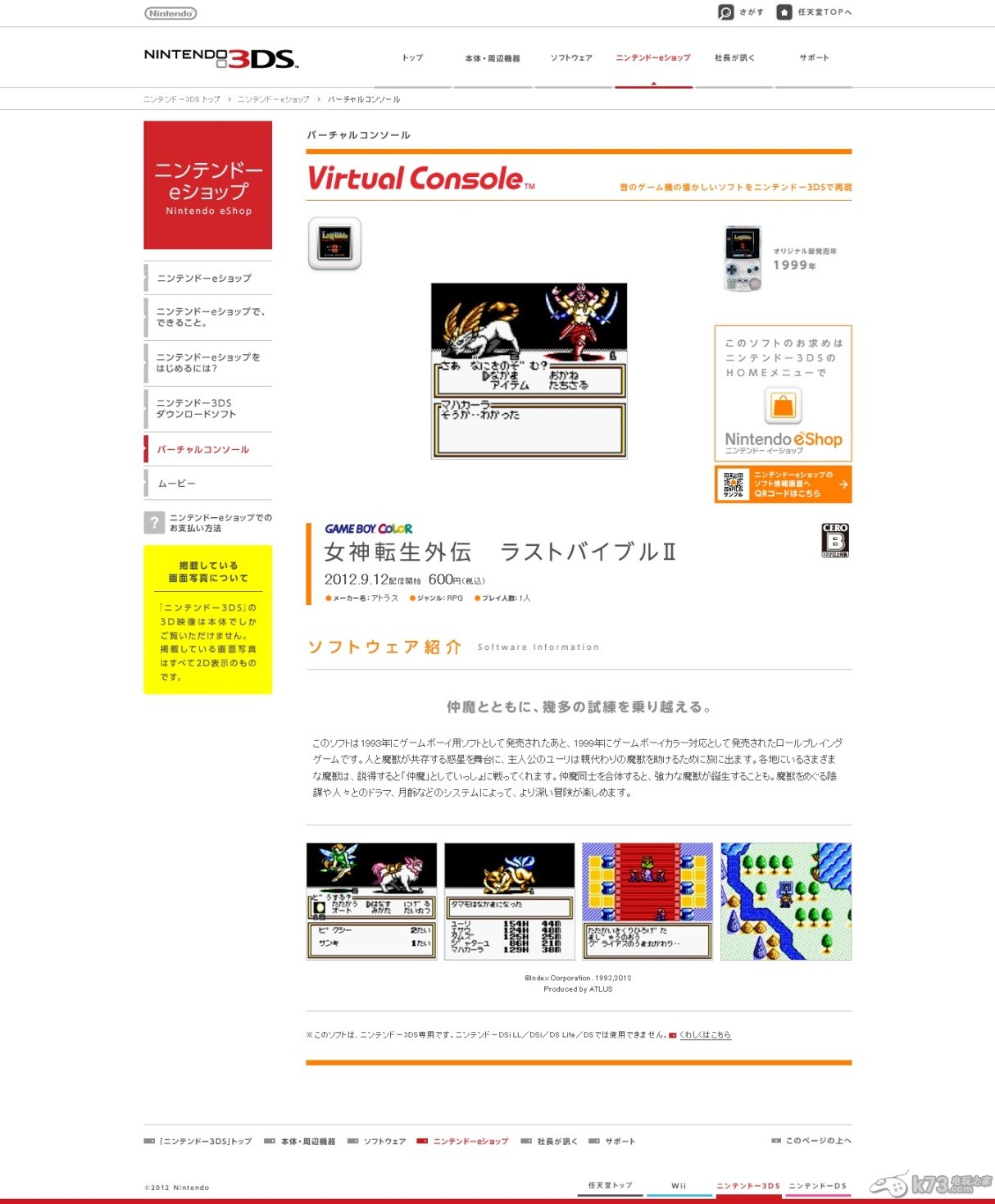 发售于GBC平台上的备受玩家好评的《女神转生外传 最后的圣经2》将会发经典游戏的身份登录任天堂的3ds vc游戏行列,本作是女神转生系列在GBC平台的外传作品,游戏的素质一如继往的优秀,本作预定于今年9月12日配信,价格为600日元,感兴趣的玩家可以在当天下载