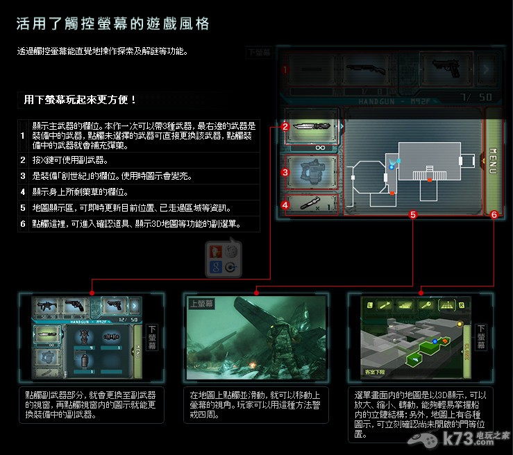 | 1 | 显示主武器的栏位。本作一次可以带3种武器,最右边的武器是装备中的武器,点触未选择的武器可直接更换该武器,点触装备中的武器就会补充弹药。 |
