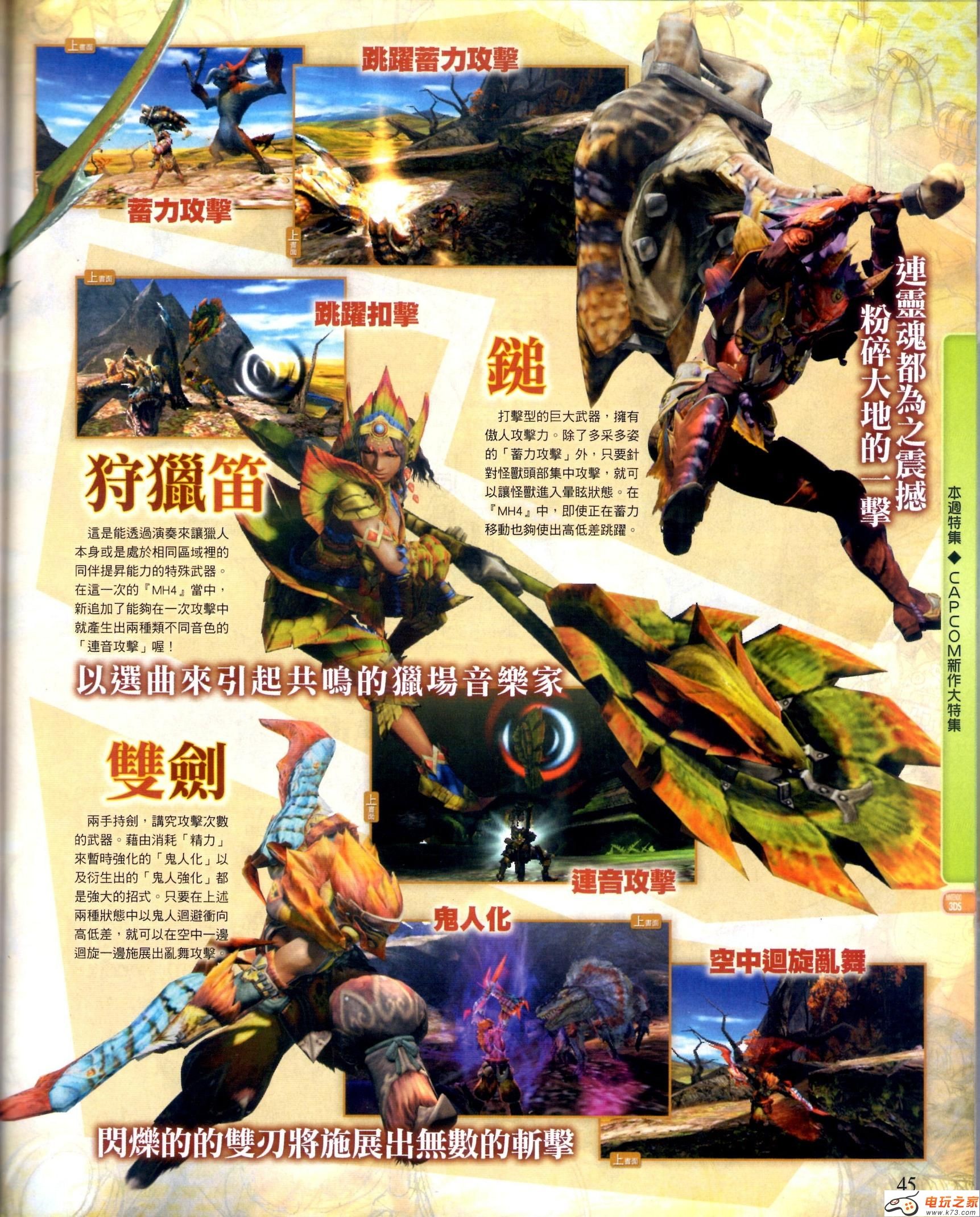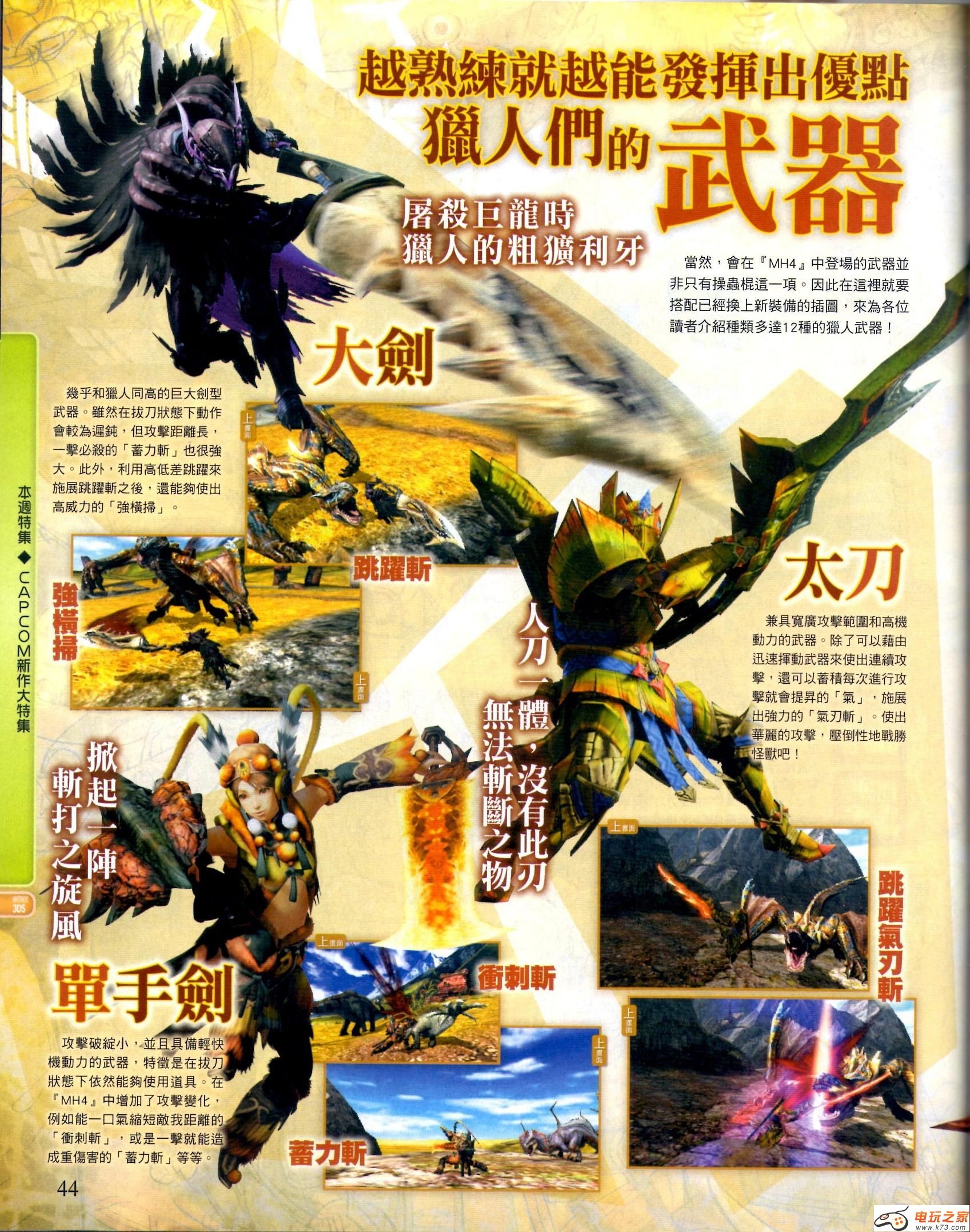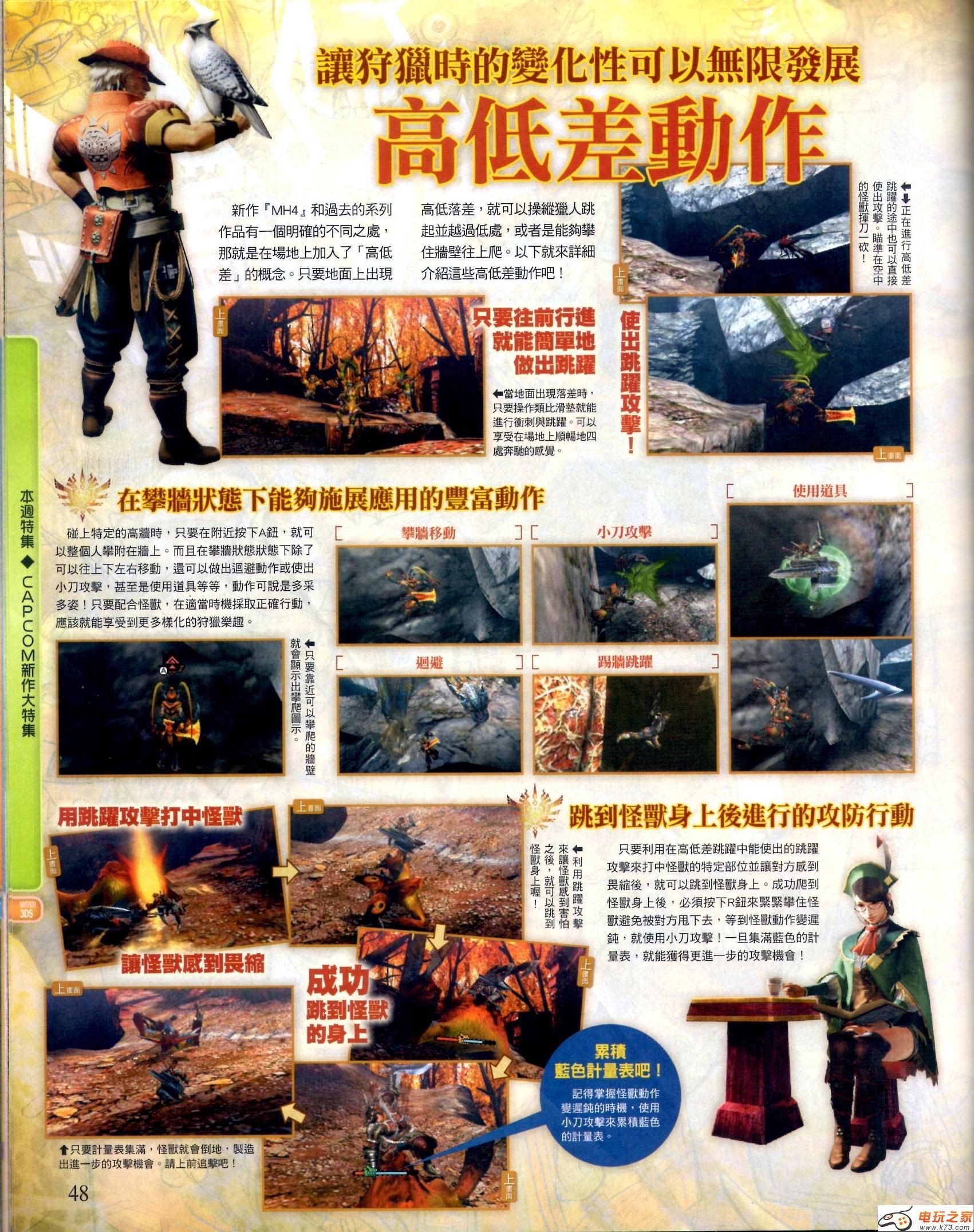 前两天我们为大家带来了本周fami通海量的关于怪物猎人4的新开操虫棍、高低差动作等的日文fami通杂志图,相信很多不懂日语的玩家一定想要知道杂志图的具体内容吧!下面就给大家分享一组杂志图的中文扫描图,为官方繁体中文哟!