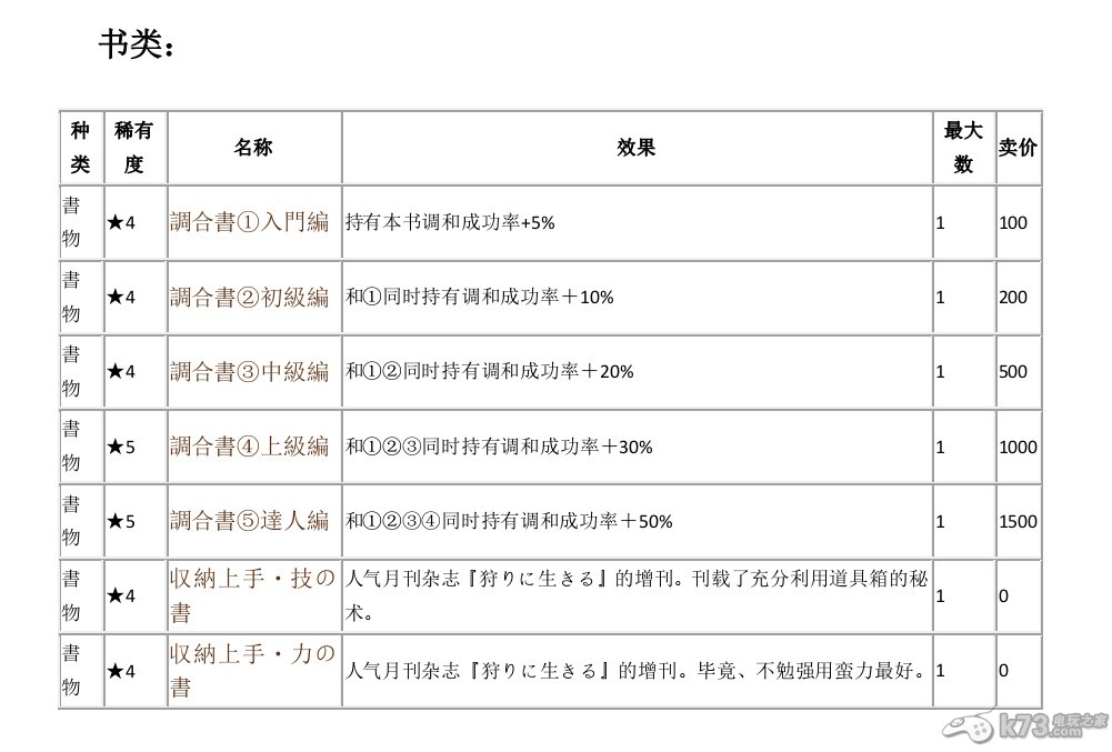相信很多日文苦手玩家表示对于《怪物猎人3G》中的道具效果及素材名称,合成所需要素材等非常的头大吧!首先不知道道具的效果让自己在合成武器或者装备时不知道从何下手,又怕担心辛苦合出来的道具和装备却是渣渣,为了方便各位童鞋制作装备和防具等,下面就给大家带来《怪物猎人3G》中的全部道具的中文效果的pdf攻略的下载。