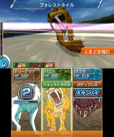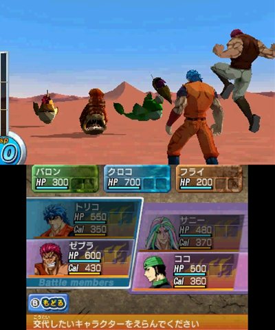 在战斗中「角色」是以指令制的方式来做攻击,而成为夥伴的「美食怪兽」在战斗中则是要触碰 N3DS 下画面来根据战况做出指示。