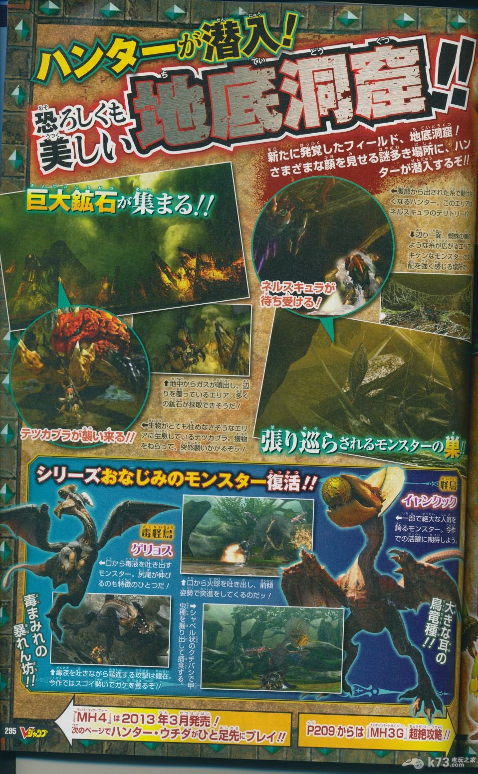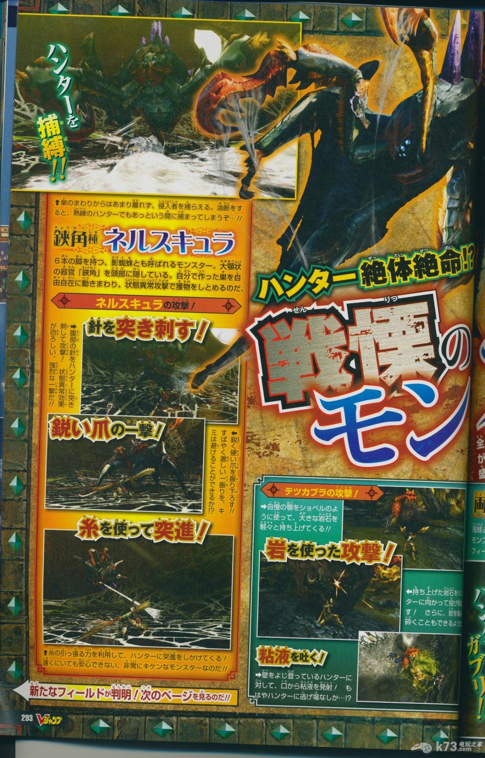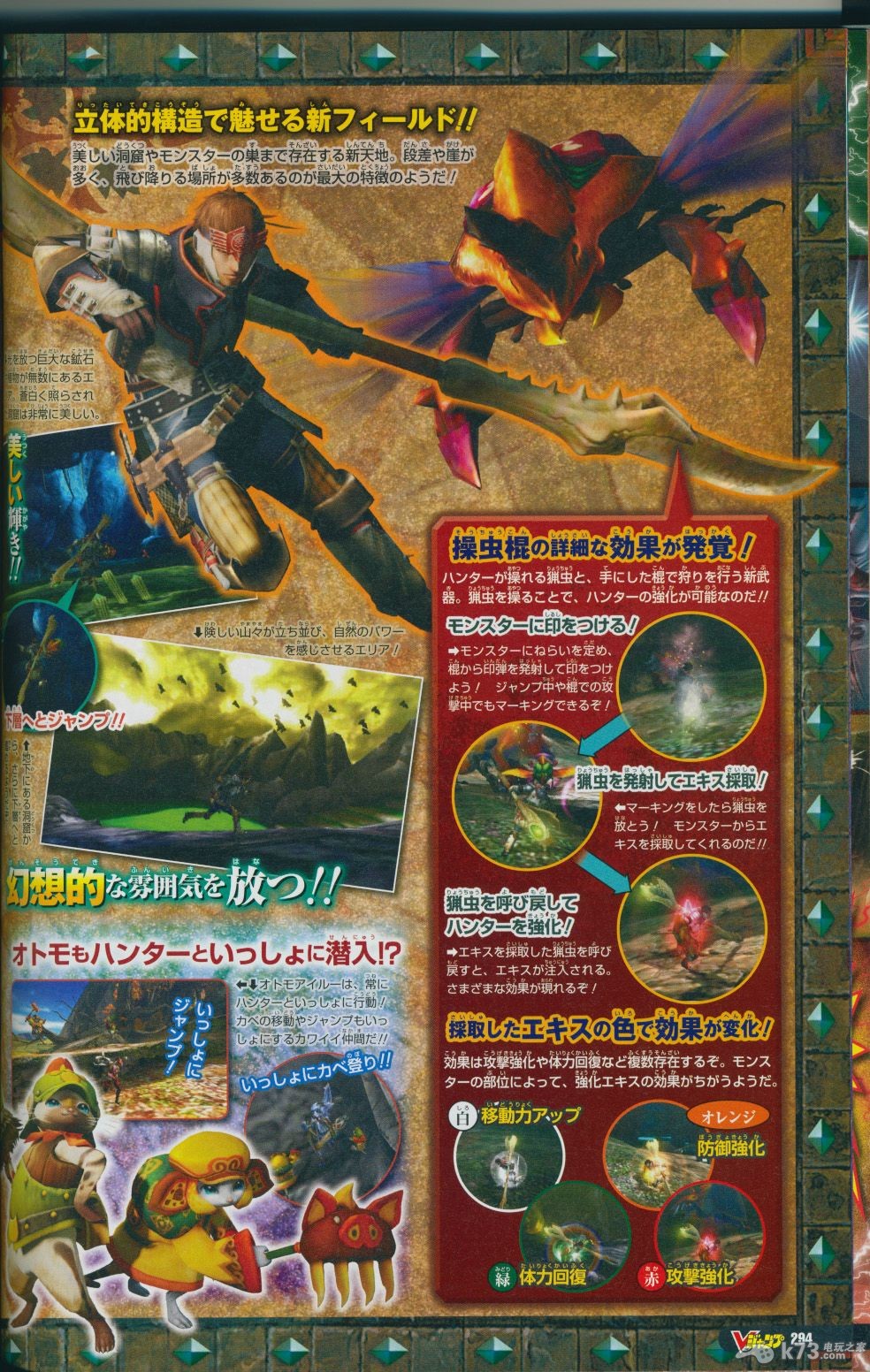 继上周fami通公布了《怪物猎人4》的新武器操虫棍、新怪物和新地图【地底洞窟】(报道),本周的少年Vjump周刊上也公布了关于这些内容的详细介绍,以下是杂志图的详情。