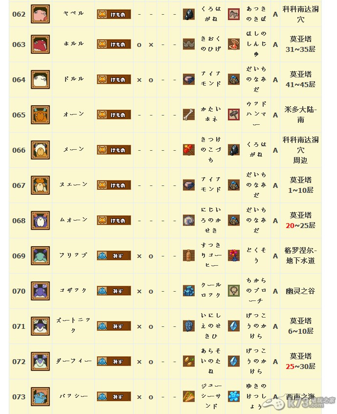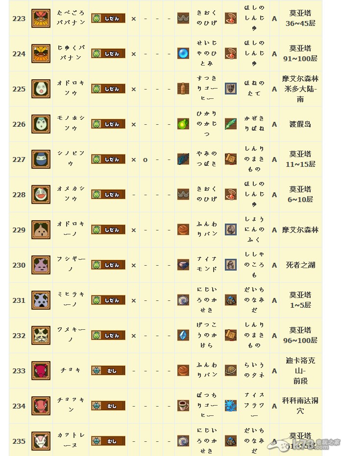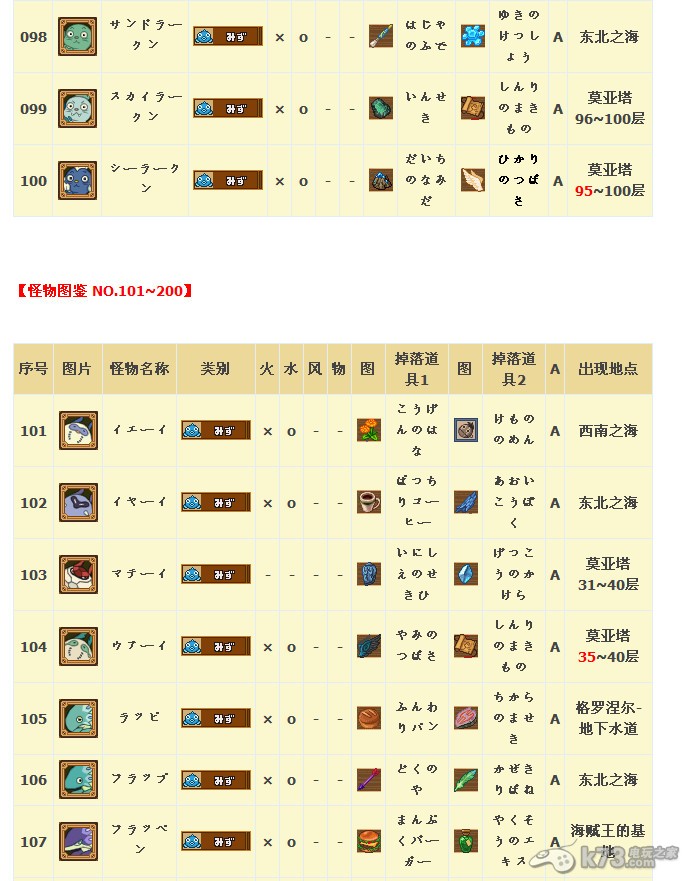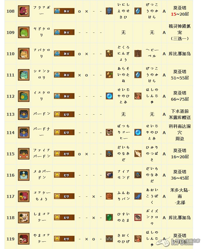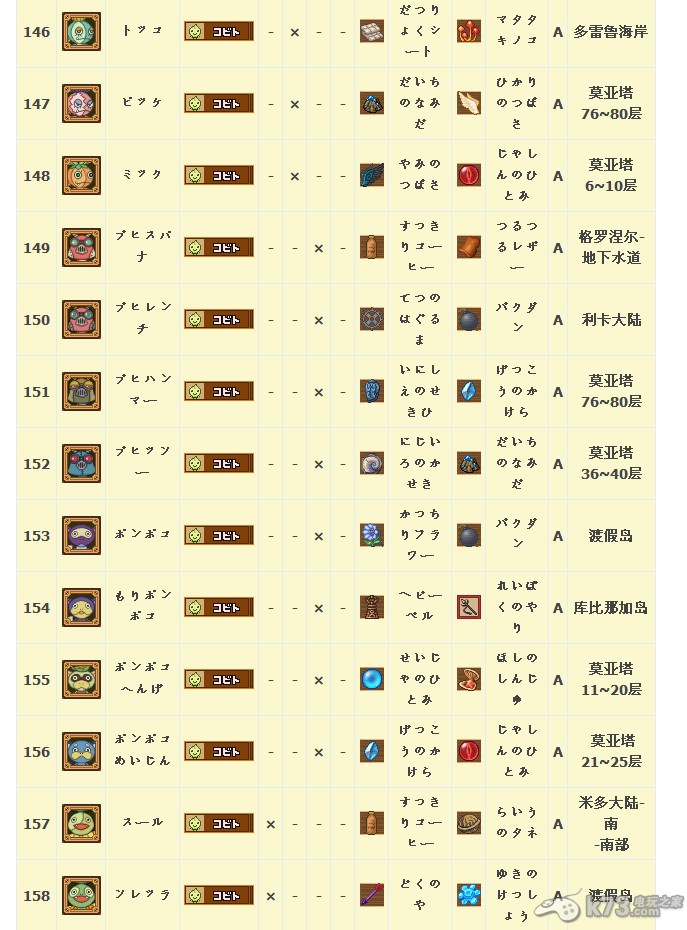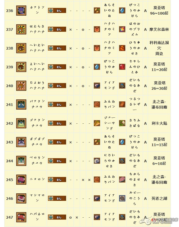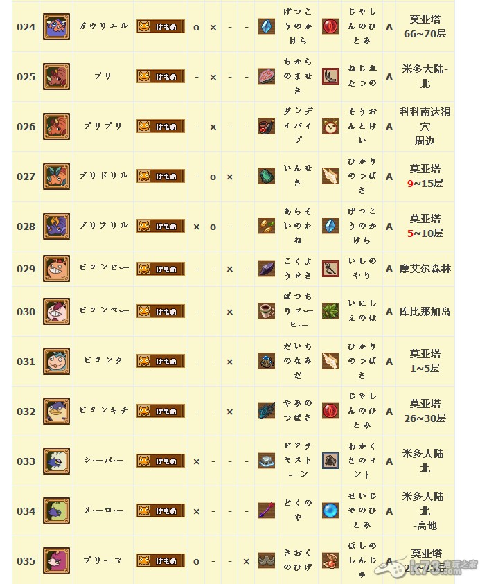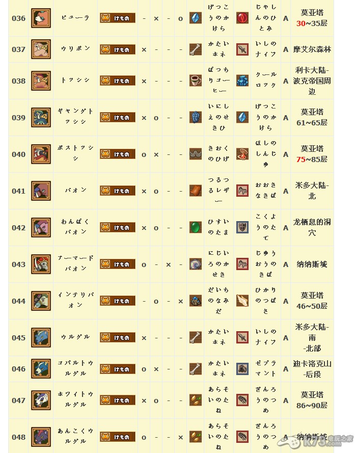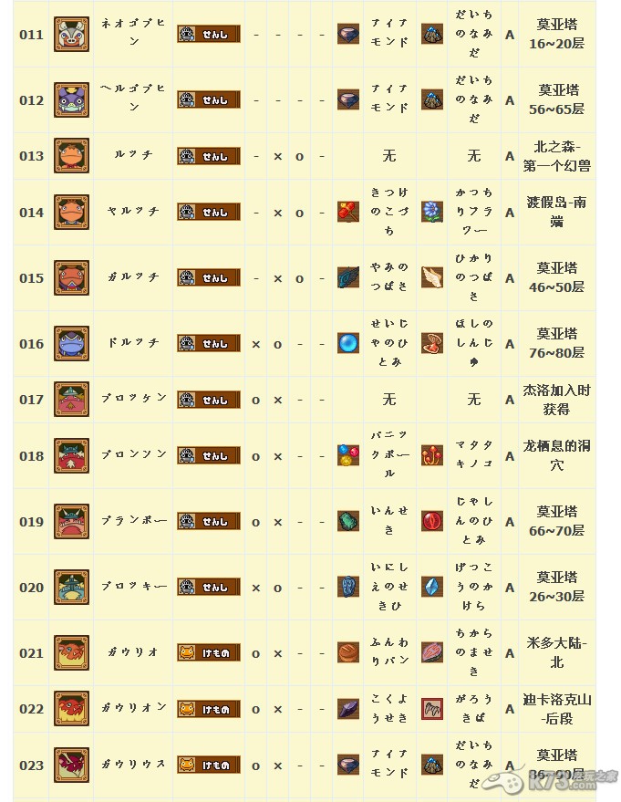 怪物图鉴&出现地点及掉落素材: